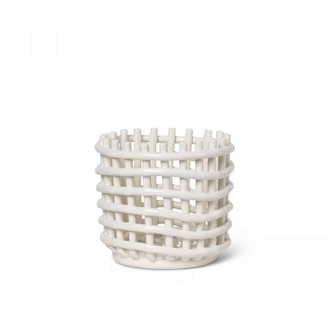 Ceramic Basket är en keramikskål från Ferm Living som för tankarna till gamla tiders vävkonst. Skålen är handgjord och påminner till stor del om en vävd korg, men i keramik. Ceramic Basket är en inredningsdetalj med ett stort antal användningsområden. Som blomkruka, för förvaring av småsaker, exempelvis i hallen, eller som fruktskål eller brödkorg.