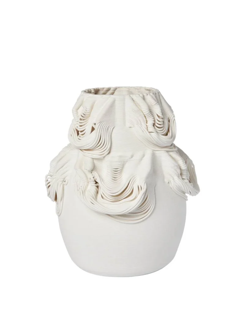 Drisca Vase förenar en traditionell silhuett med 3D-printad keramik och lyfter fram det nyskapande hantverket. Den oglaserade, matta ytan framhäver materialets taktila kvalitet, medan de bandliknande mönstren påminner om flödet i ett tyg. Vasen är snygg till torkade blommor eller i sig själv och framstår som en skulptur på hyllor, konsoler eller piedestaler.