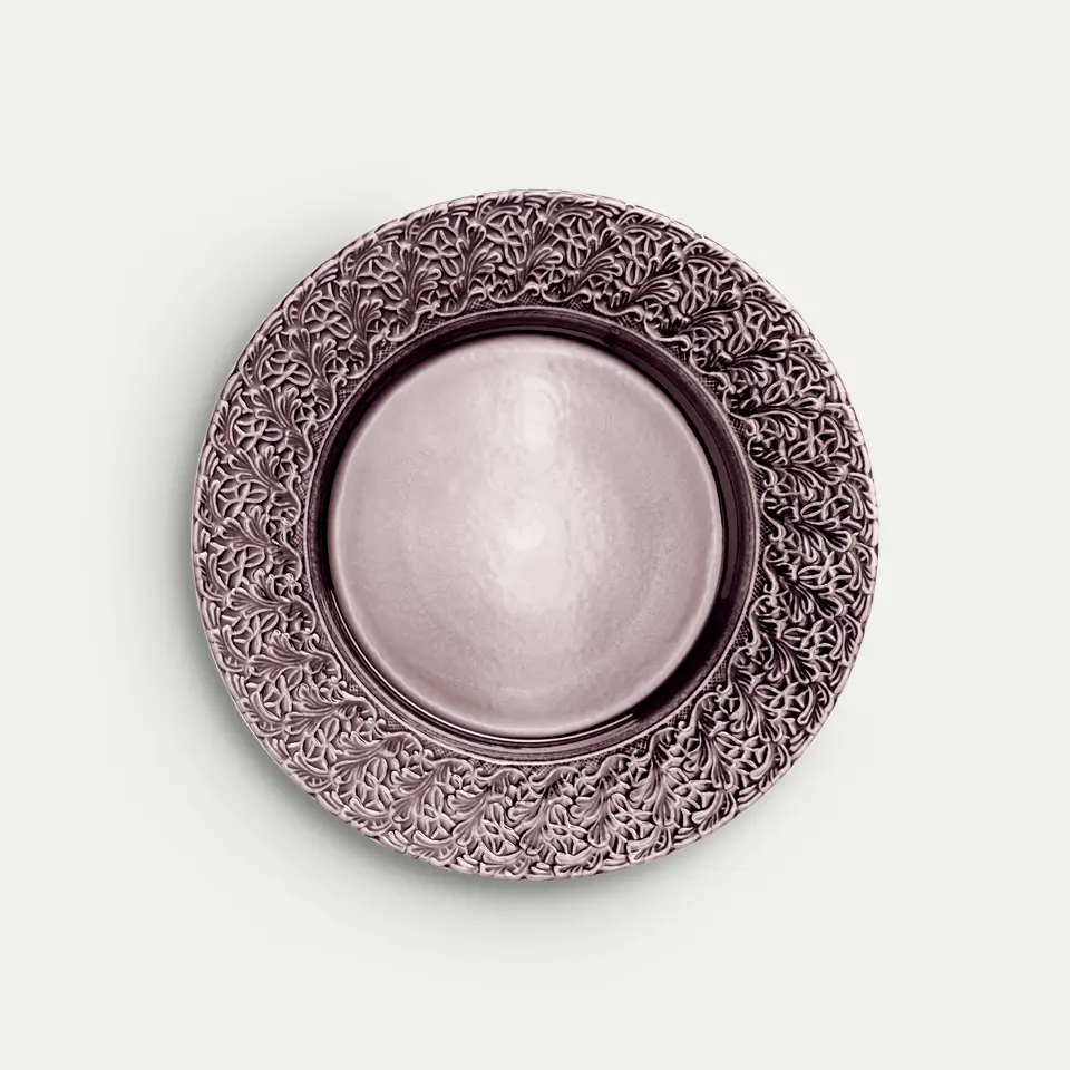 Denna signaturtallrik från Mateus kollektion Lace är ett romantiskt inslag på middagsbordet. Dess generösa storlek gör att den fungerar lika bra till uppläggning av mindre tilltugg, desserter eller frukt. Finns tillgänglig i 13 olika färger.