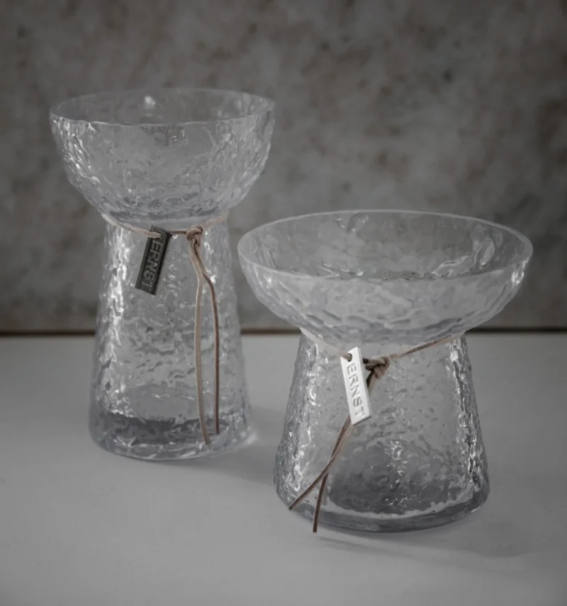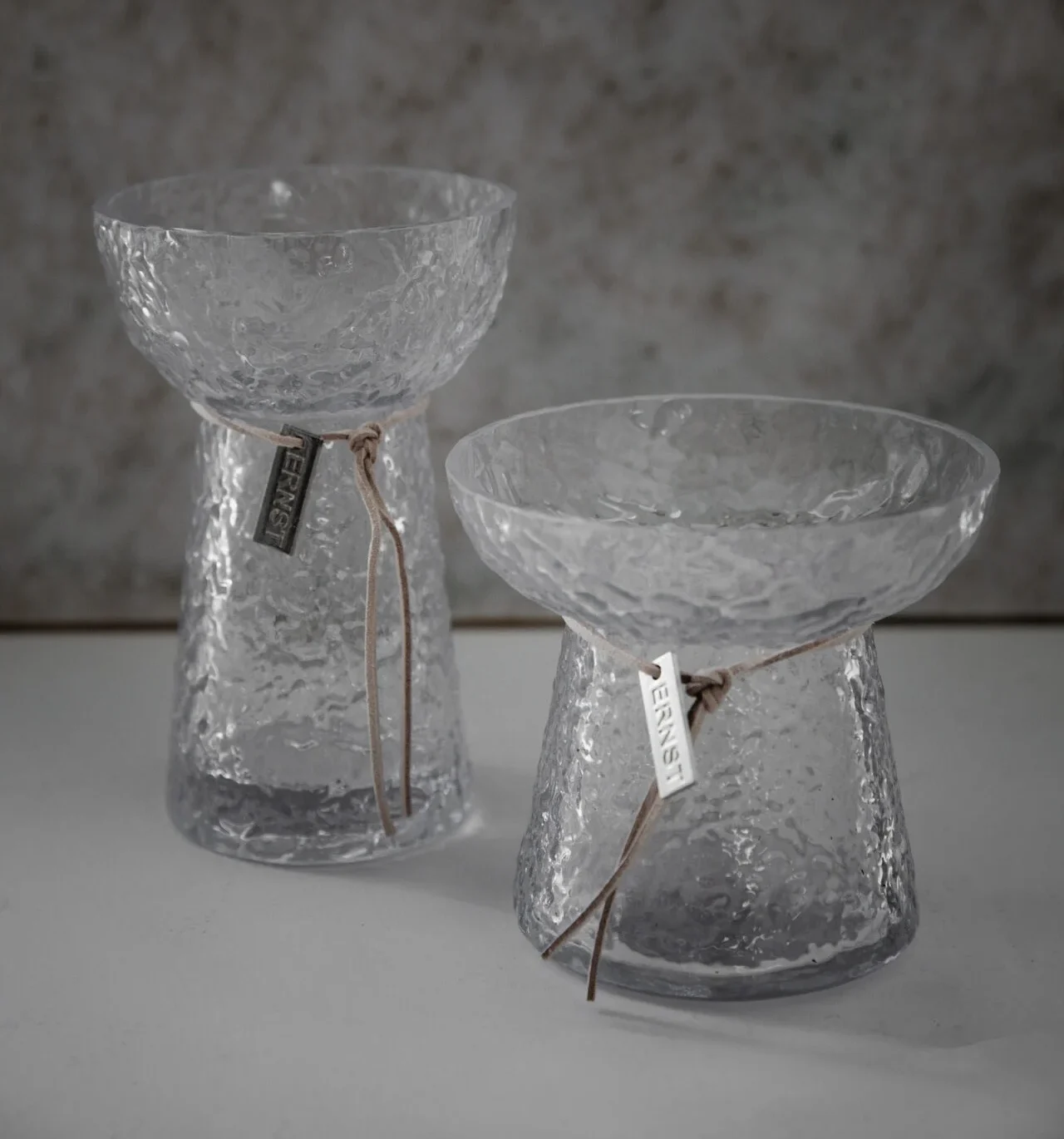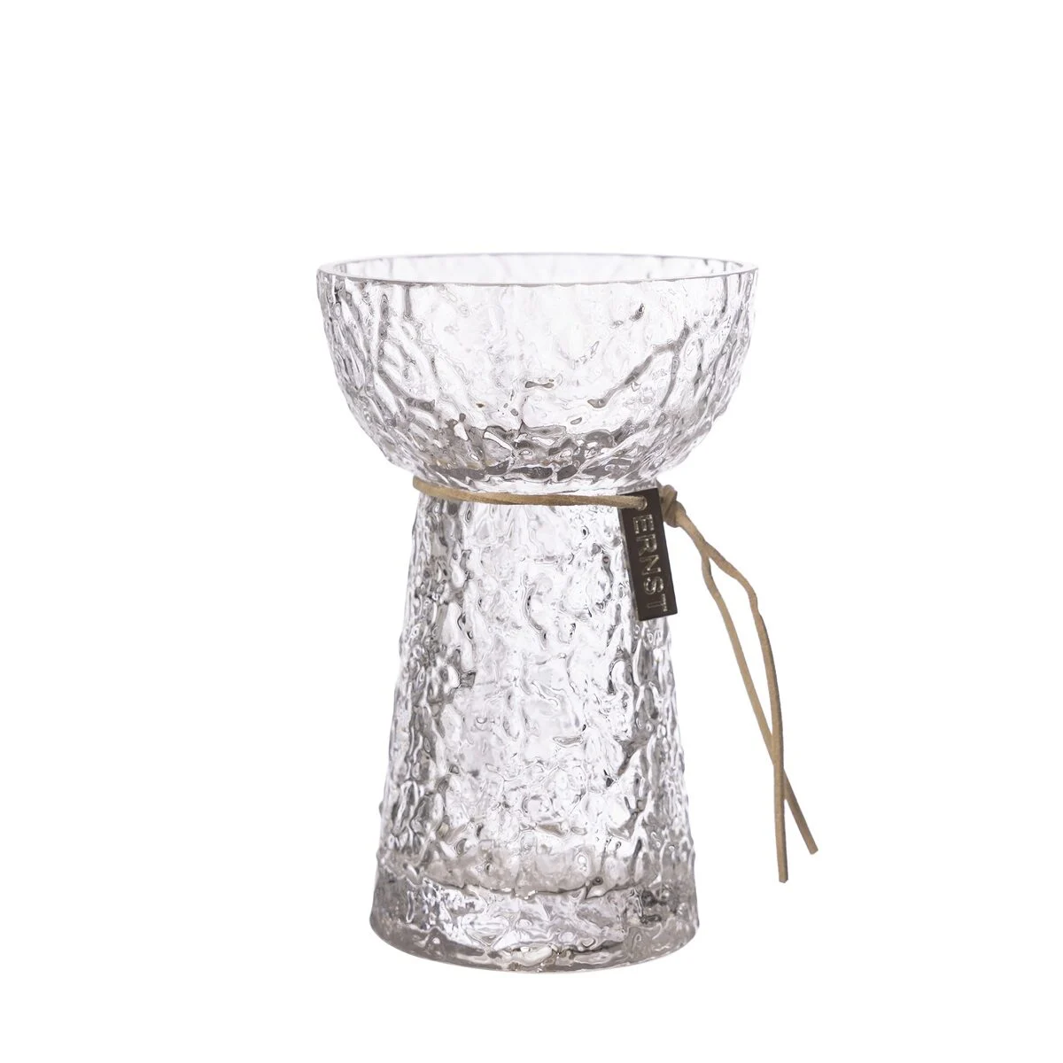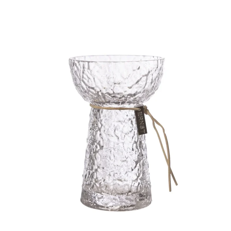 Lökvas d9 h15cm mönstrad. Fin lökvas i mönstrat glas med det klassiska läderbandet som fin detalj, ingår i samma serie som ERNST runda mönstrade glasvaser.
