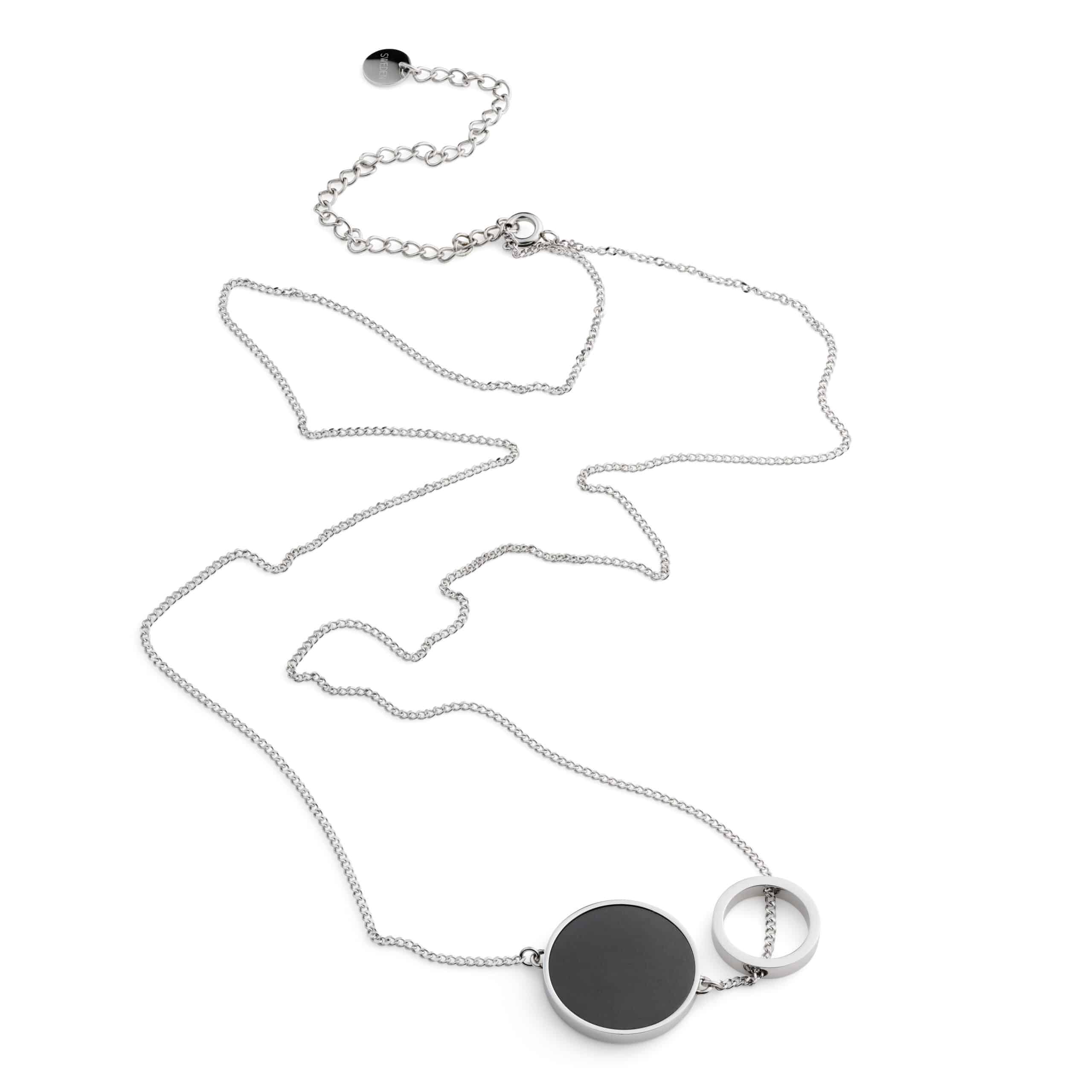Elegant halsband med mörk karaktär. Bärbar Skandinavisk design. Det här smycket passar till allt! LUNA betyder måne på Latin. Kollektionen är inspirerad av månens mystik och 60-talets experimentella design. Just det här halsbandet med två cirklar är en tolkning av månförmörkelse. Embrace the darkness. Let Lunar power be you!