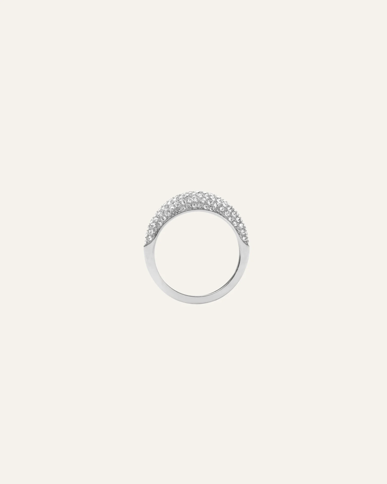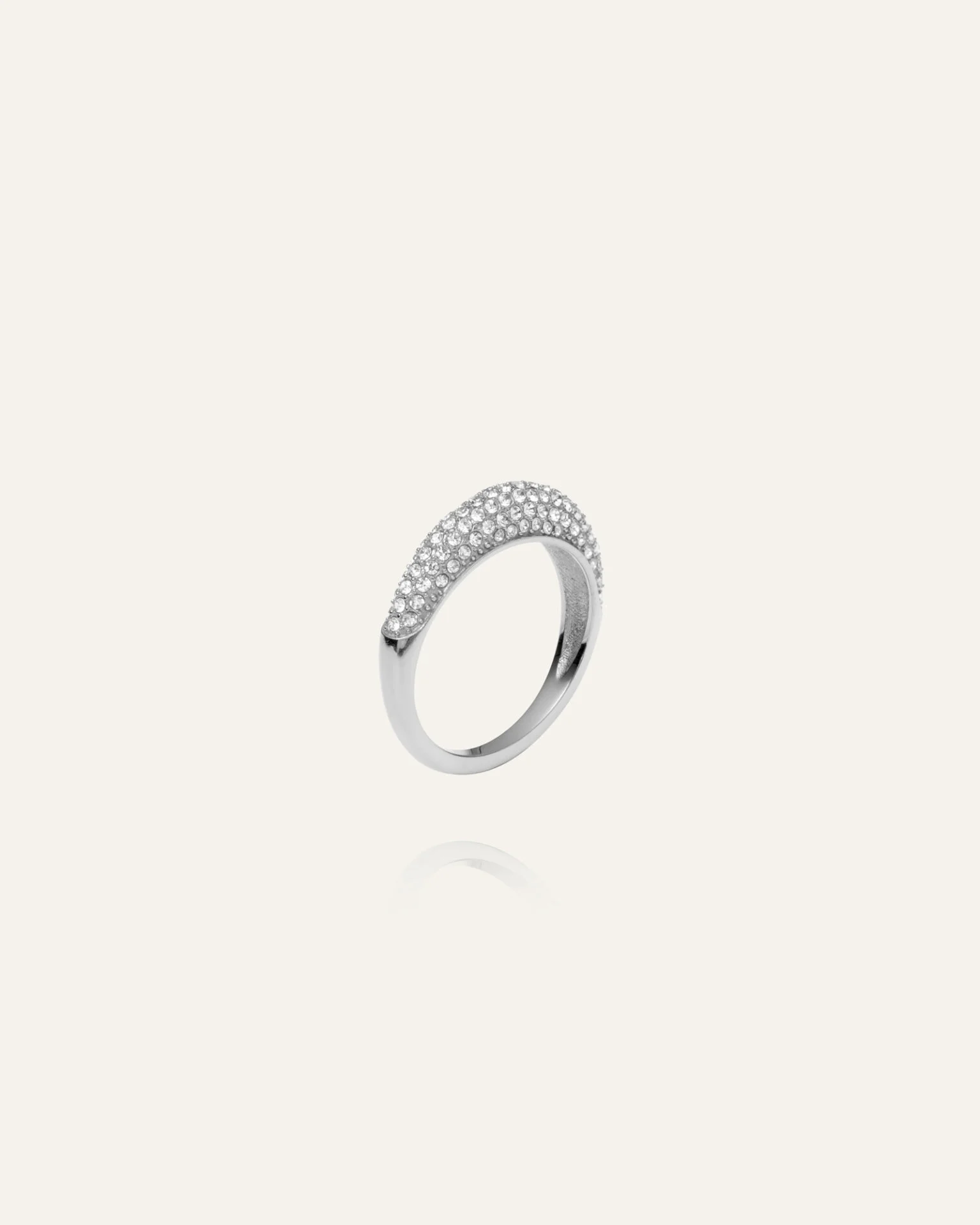 En elegant ring med rundad design, där ovansidan är dekorerad med små Cubic Zirconia-stenar och undersidan är slät. Tillverkad i massivt rostfritt stål med en slitstark PVD-plätering, vilket gör den vattentålig och hållbar. Bär den varje dag – bada, duscha och träna utan att oroa dig för att den tappar färg.