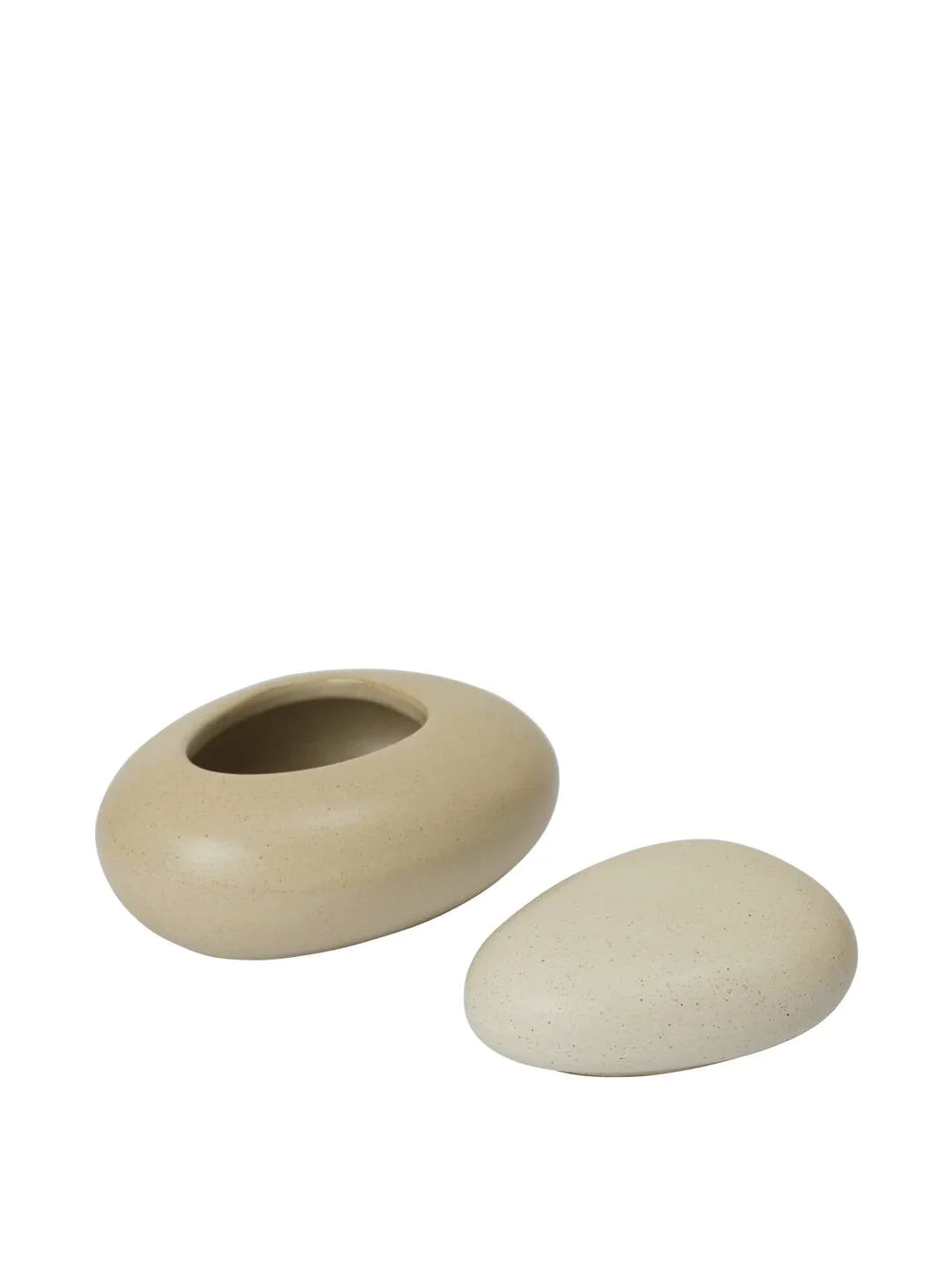 Pebble Asken är inspirerad av den naturliga skönheten i fina stenar som ligger staplade längs stränderna, och varje låda efterliknar stenarnas släta, rundade former. Den är tillverkad av glaserad keramik och har en elegant, polerad yta som framhäver designens elegans och lugnande inverkan. Pebble Asken finns i olika storlekar och kan placeras var för sig eller staplas på varandra för en dynamisk lager-på-lager-look.