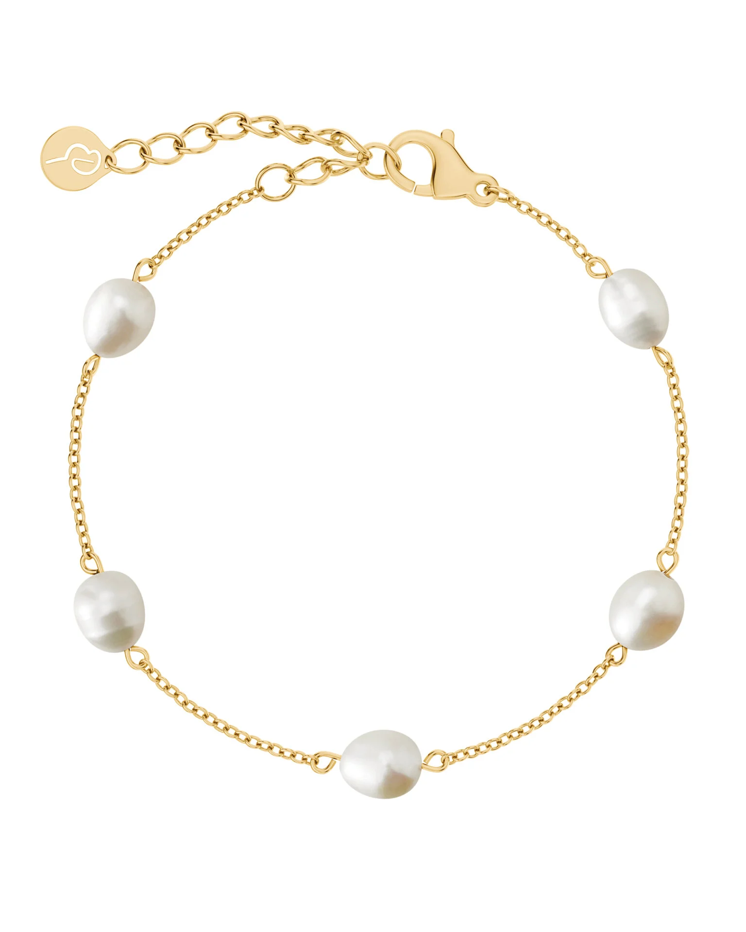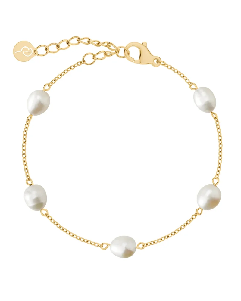 Perla är en serie med fina sötvattenpärlor som med sin naturliga form ger spänning och elegans, samt att varje smycke i sig blir unikt. I Perla multiarmband är fem vackra sötvattenpärlor länkade med en fin kedja i blank 14K guldplätering. Kombinera med andra delar ur serien Perla.