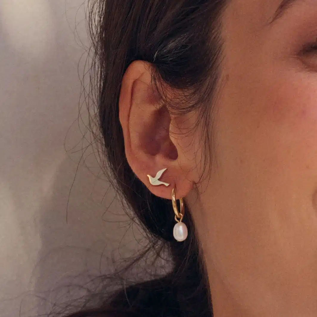 Perla är en serie med fina sötvattenpärlor som med sin naturliga form ger spänning och elegans, samt att varje smycke i sig blir unikt. Perla creoler har en liten sötvattenpärla som hänger i ringen som här är i blank 14K guldplätering. Bär gärna Perla halsband till.