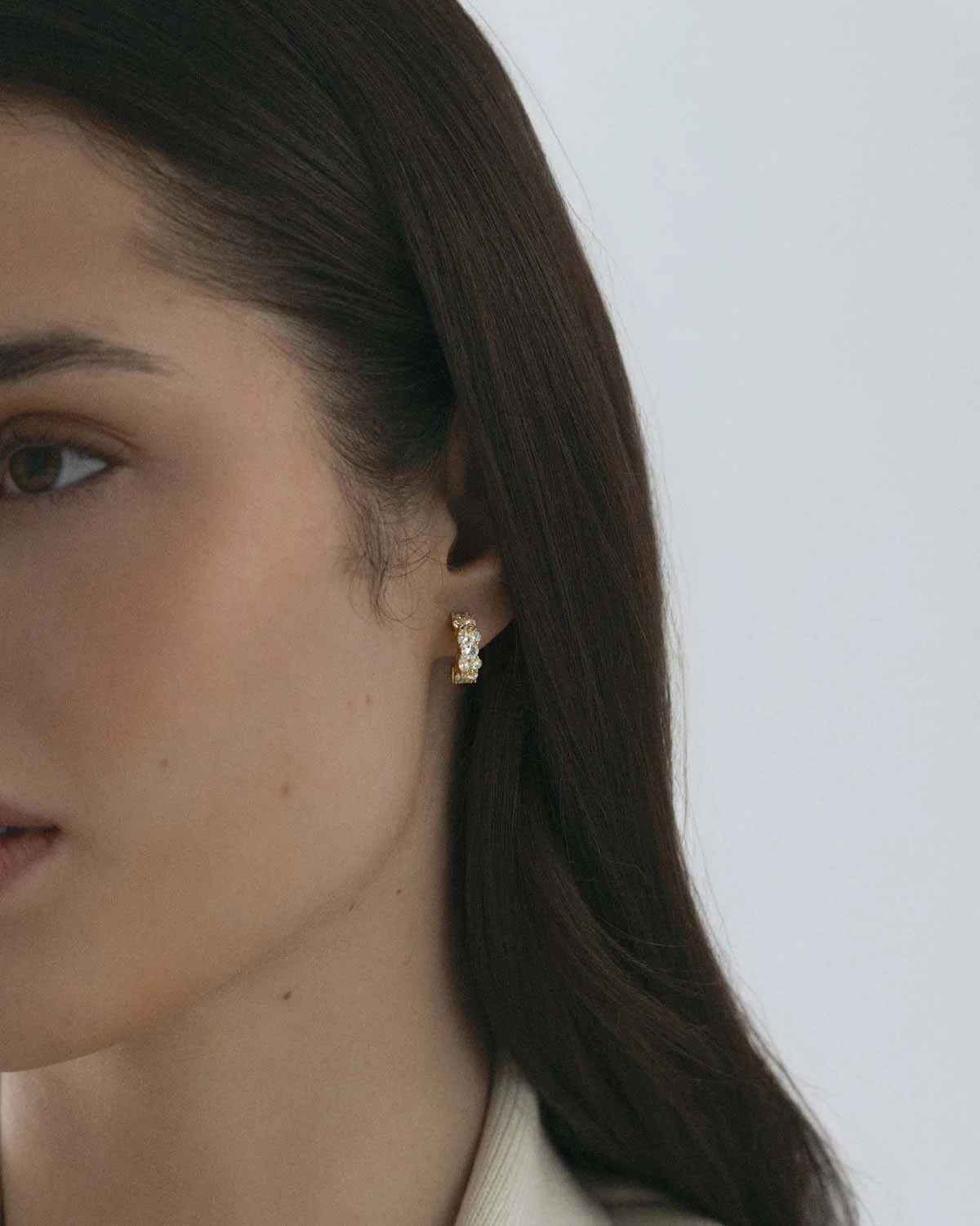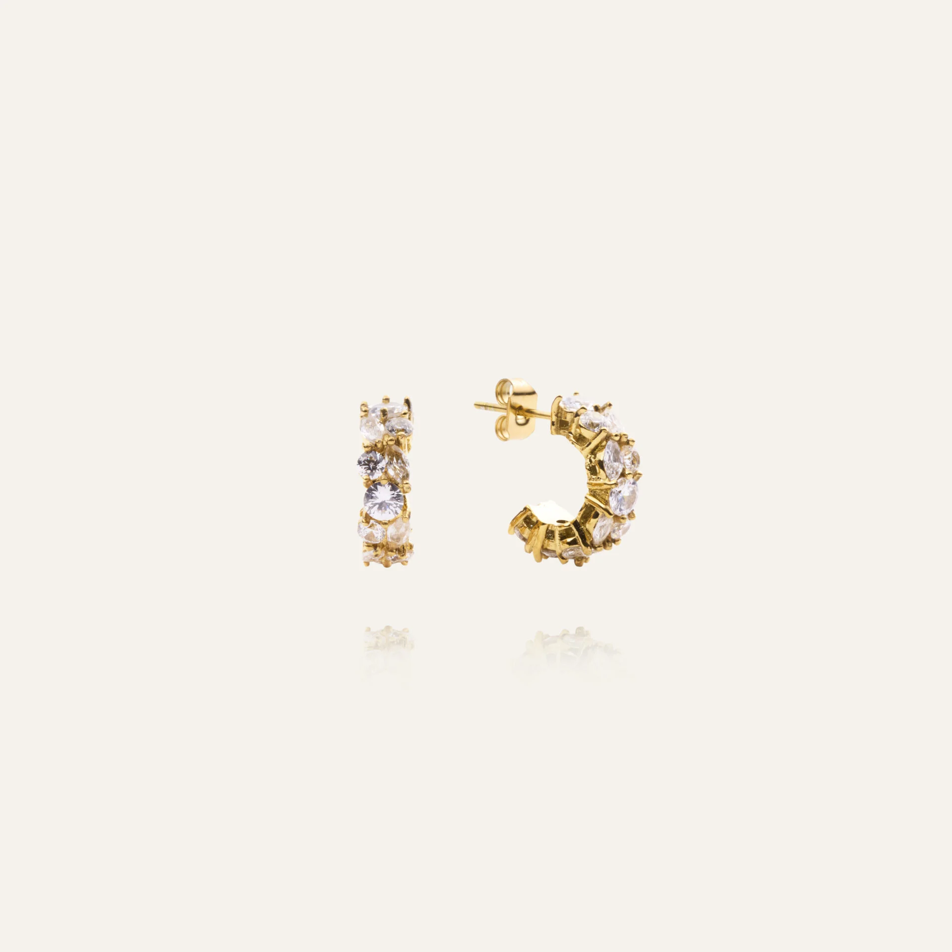 Eleganta örhängen dekorerade med Cubic zirconia-stenar. Tillverkade i rostfritt stål med 18K guld PVD-plätering är de både slitstarka och vattentåliga, vilket gör att de behåller sin färg och stil över tid. Designade som en hyllning till kvinnor världen över.