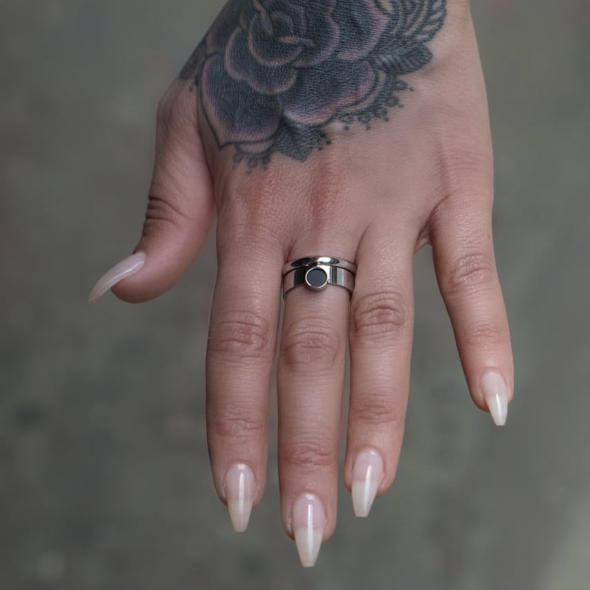 Ringens storlek: 17 mm i diameter, bredd på ringskenan 7 mm i omfång, svart cirkeldetalj är 6 mm.