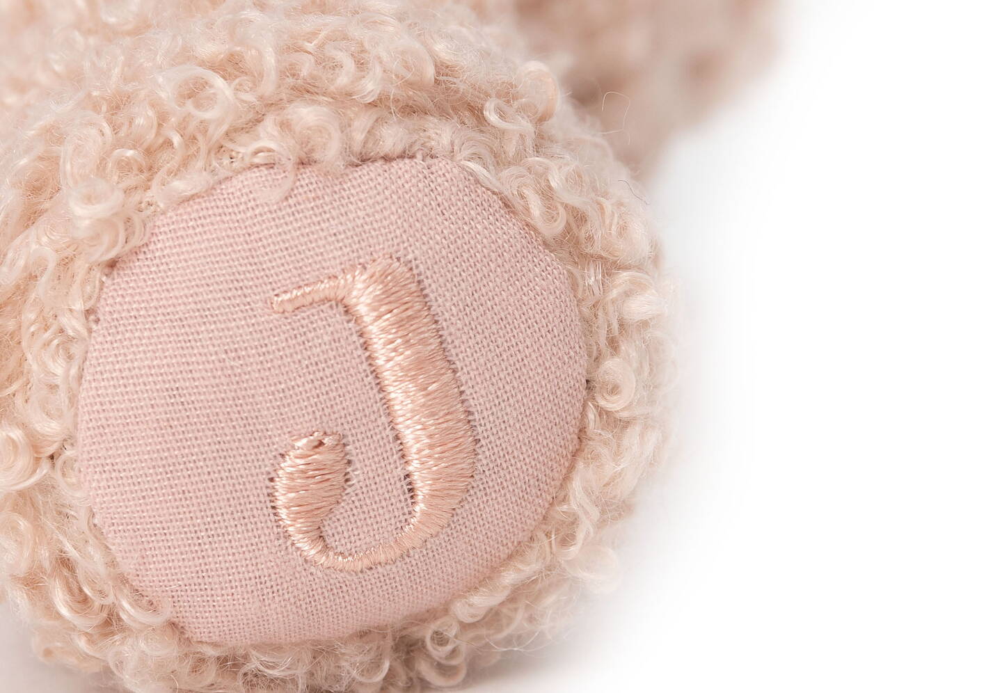 Jollein Skallra Teddy Bear Wild Rose i super mjuk bouclé är en greppvänlig skallra med en liten bjällra inuti.