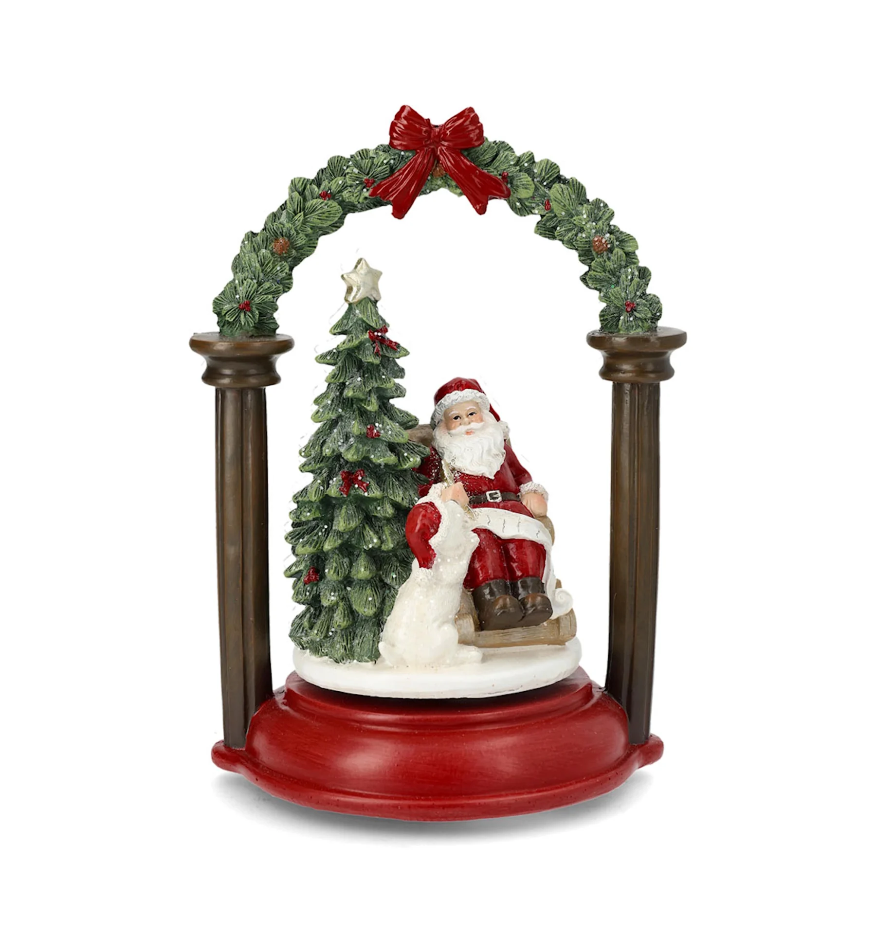 Få den där härliga julkänslan med en speldosa med Jultomte vid en julgran. Tillverkad av poly.