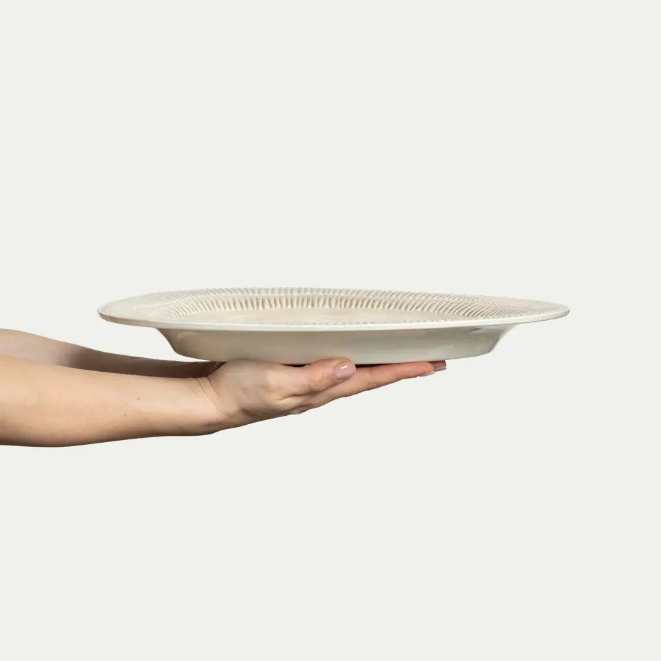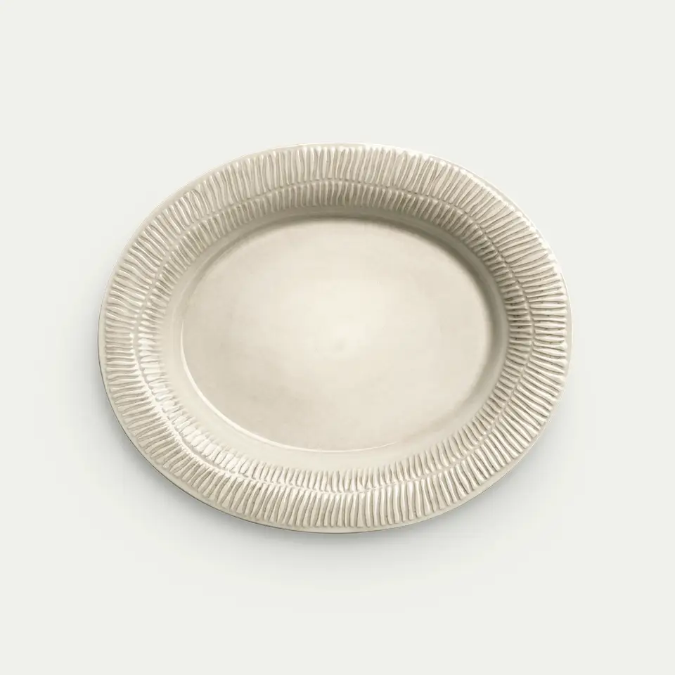Mateus Stripes fat är en funktionell ögonsten som passar perfekt för att servera större rätter eller mindre aptitretare. Dess mjuka former balanseras med ett grafiskt mönster av organiska streck som dekorerar dess kanter. Alla fat är formade, målade och glaserade för hand, vilket ger varje föremål en unik attityd med personliga detaljer. Upptäck och utforska de obegränsade möjligheterna i ditt eget skapande genom att duka upp bordet tillsammans med dina olika favoriter från Mateus andra kollektioner.