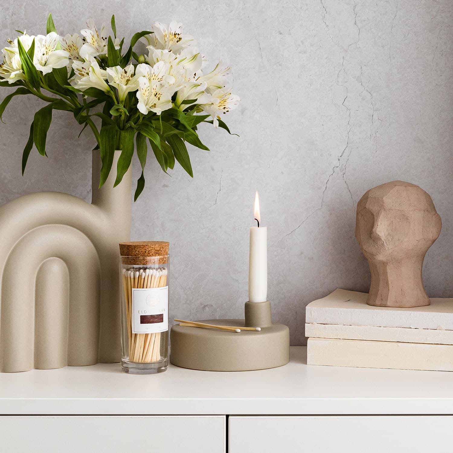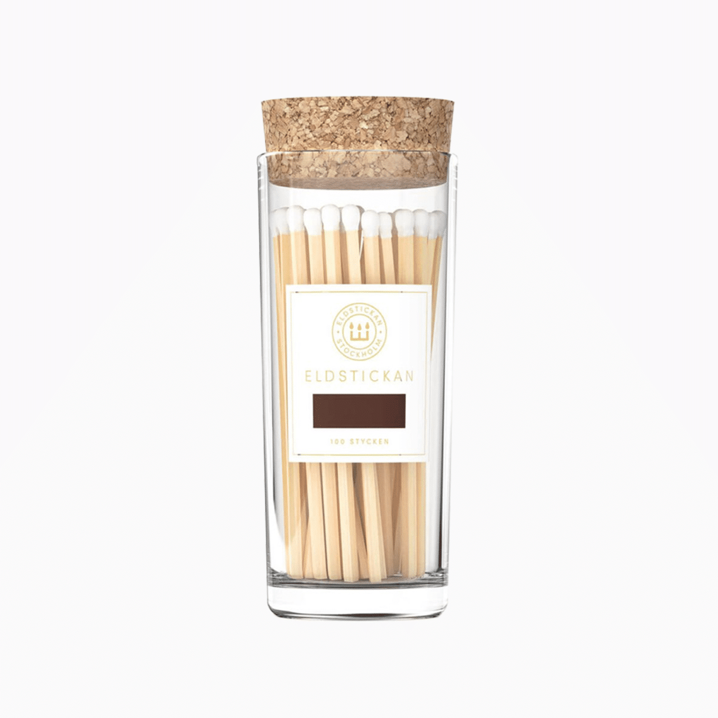 Stora Eldstickan är en 15 cm hög, stilren glasbehållare med korklock, elegant vit etikett och långa stadiga stickor med vit topp. Förpackningen rymmer ca 100 stickor och har plån på etiketten. Den vita färgen har blivit ett signum för skandinavisk minimalism och är en stilsäker klassiker som alltid känns rätt.