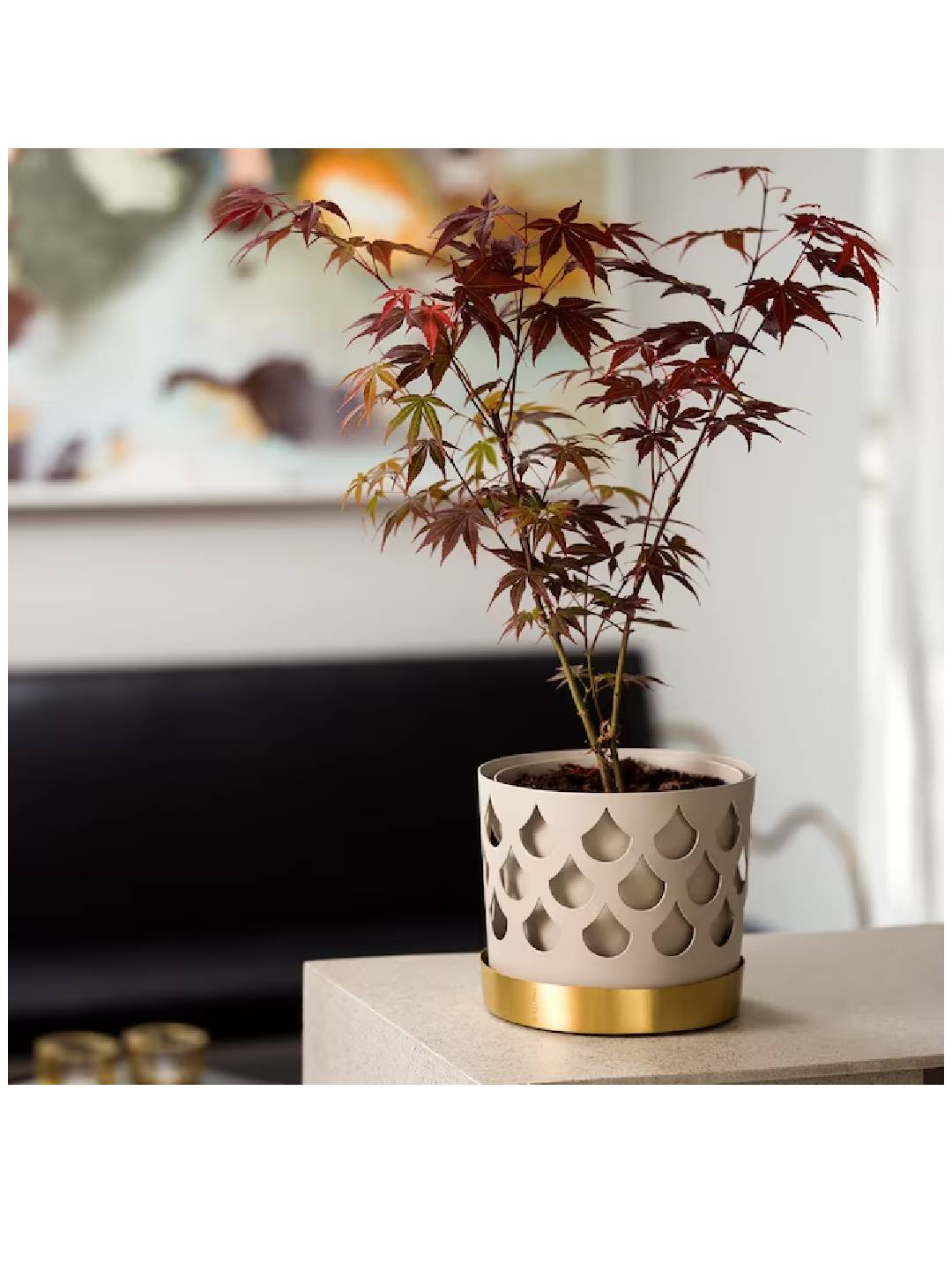 Det fina genombrutna mönstret till blomkrukorna skapar fint djup och ger karaktär utan att ta uppmärksamhet från växten. Varje kruka har tre delar; innerkruka, ytterkruka samt fat. Krukorna är tillverkade i rostfritt stål och sedan varsamt lackerade för en matt porslinsaktig yta. Fatet är tillverkat i borstad mässing.