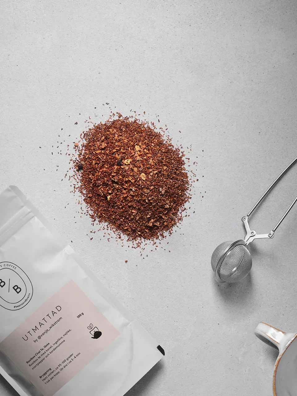 Rooibos te med kanel, ingefära, nejlika, svartpeppar och kardemumma.