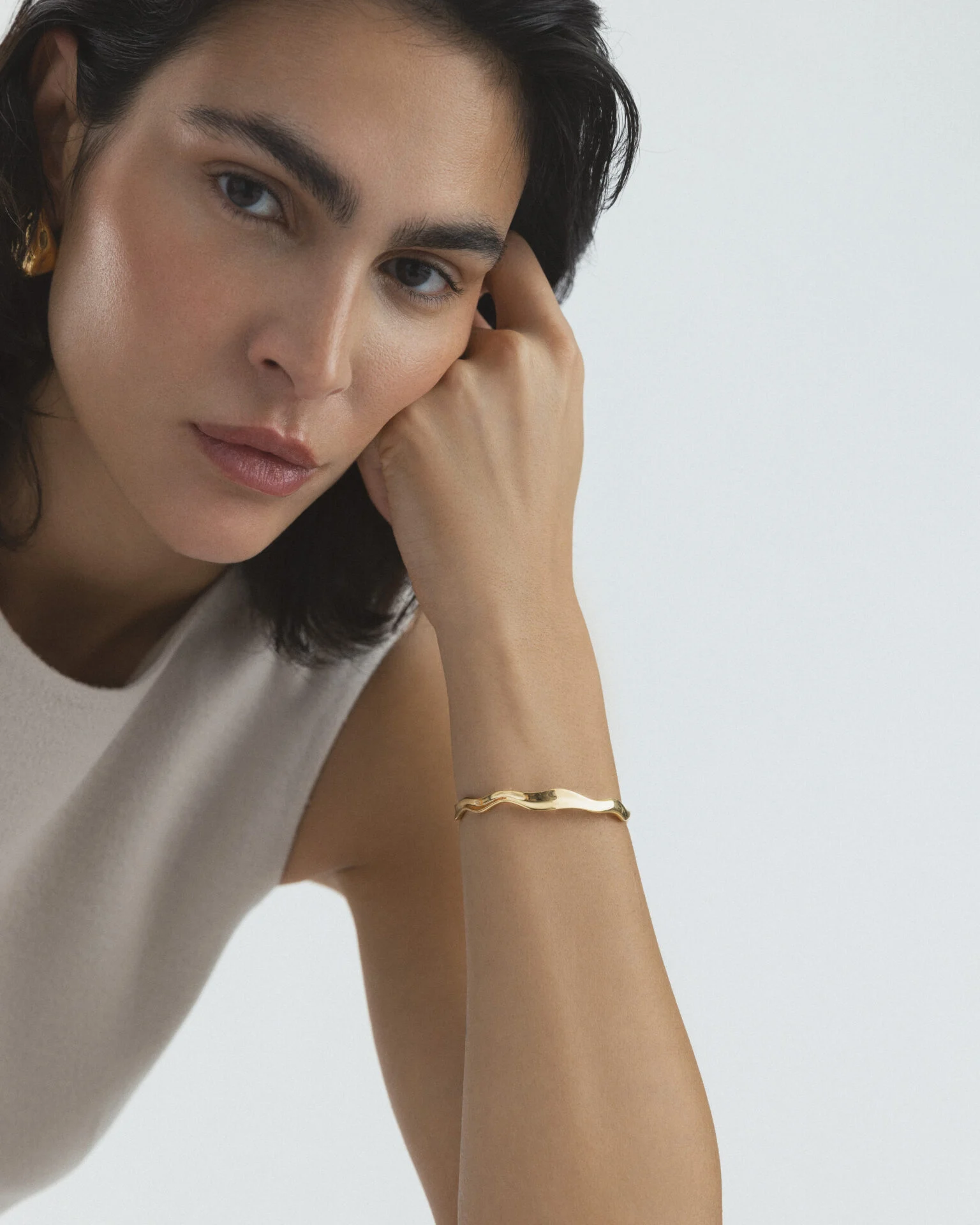 Wavy Bolded Cuff Bracelet är armbandet med den ikoniska vågiga designen i vår Wavy-kollektion. Armbandet är tillverkat i högkvalitativt stål och förgyllt med en 18K guld PVD-beläggning. Det vattentåliga armbandet erbjuder en flexibel passform som anpassar sig efter din handled.